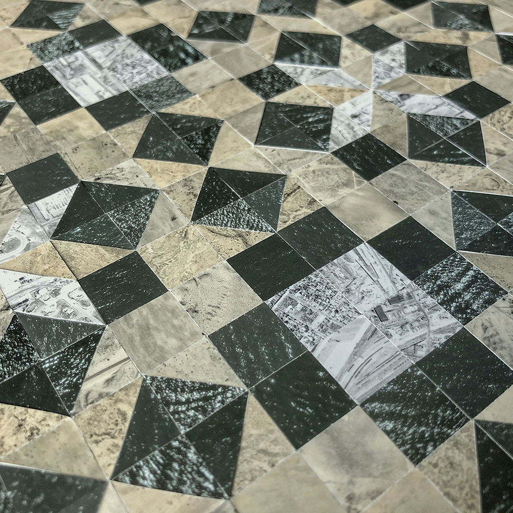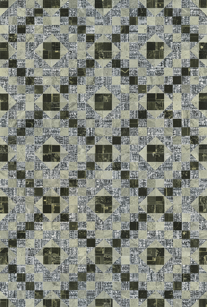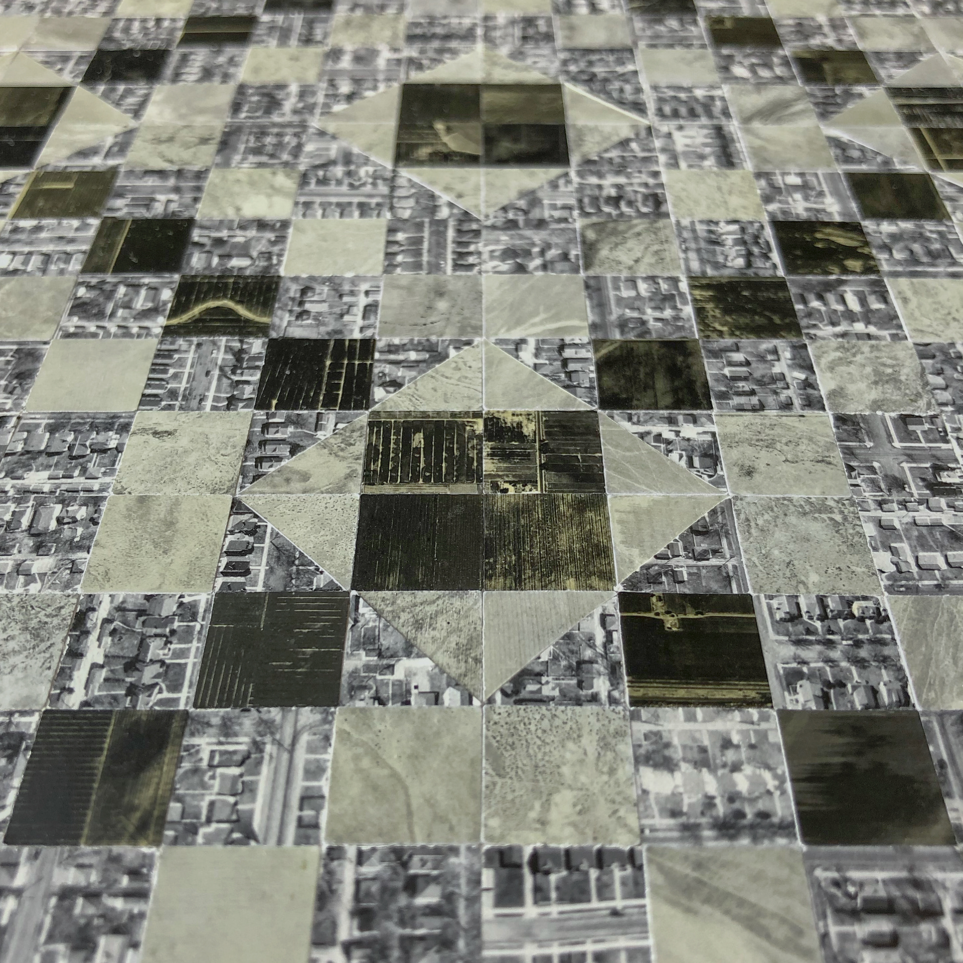 Covering combines 1/2” square and triangle sections cut from found aerial photographs of the Earth's surface to produce quilt patterns. These pieces use photos of neighborhoods, cities, farmland, bodies of water, rugged terrain, and other landscapes to create the various textures. Much like the Earth, a quilt documents the lives of numerous generations and requires care to endure as it is handed down over time. The titles of these pieces (Mosaic Star, T Squares, Stars and Windows Variation, and Prairie Queen Variation) reference the traditional quilt patterns followed to create them.