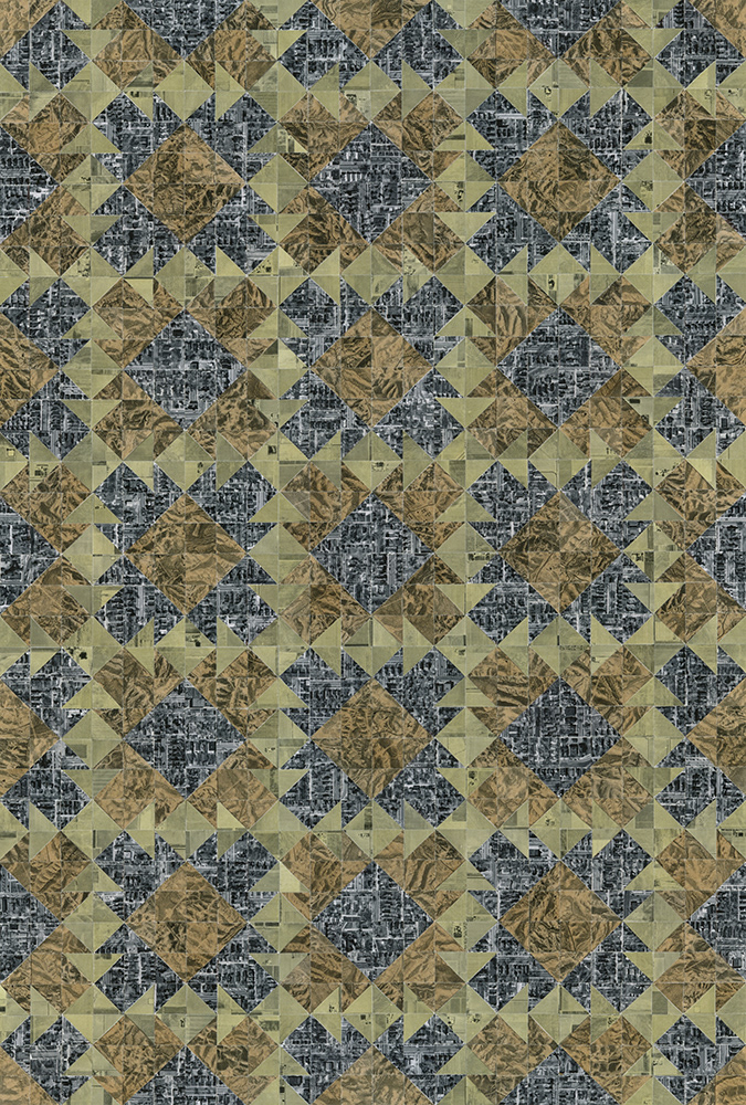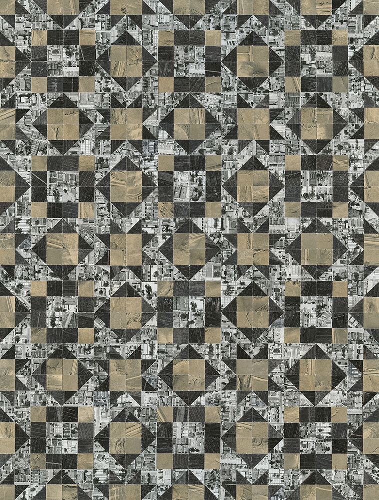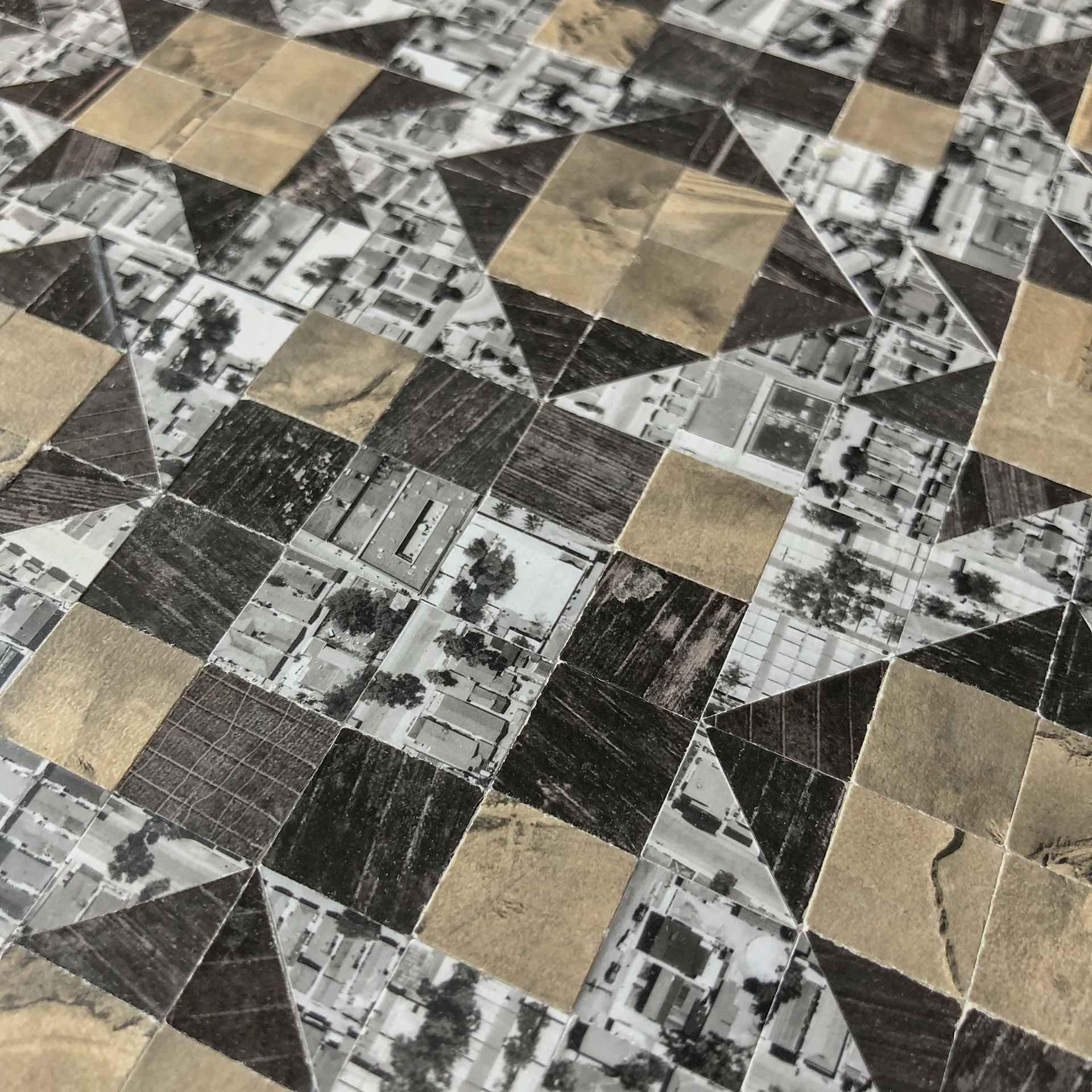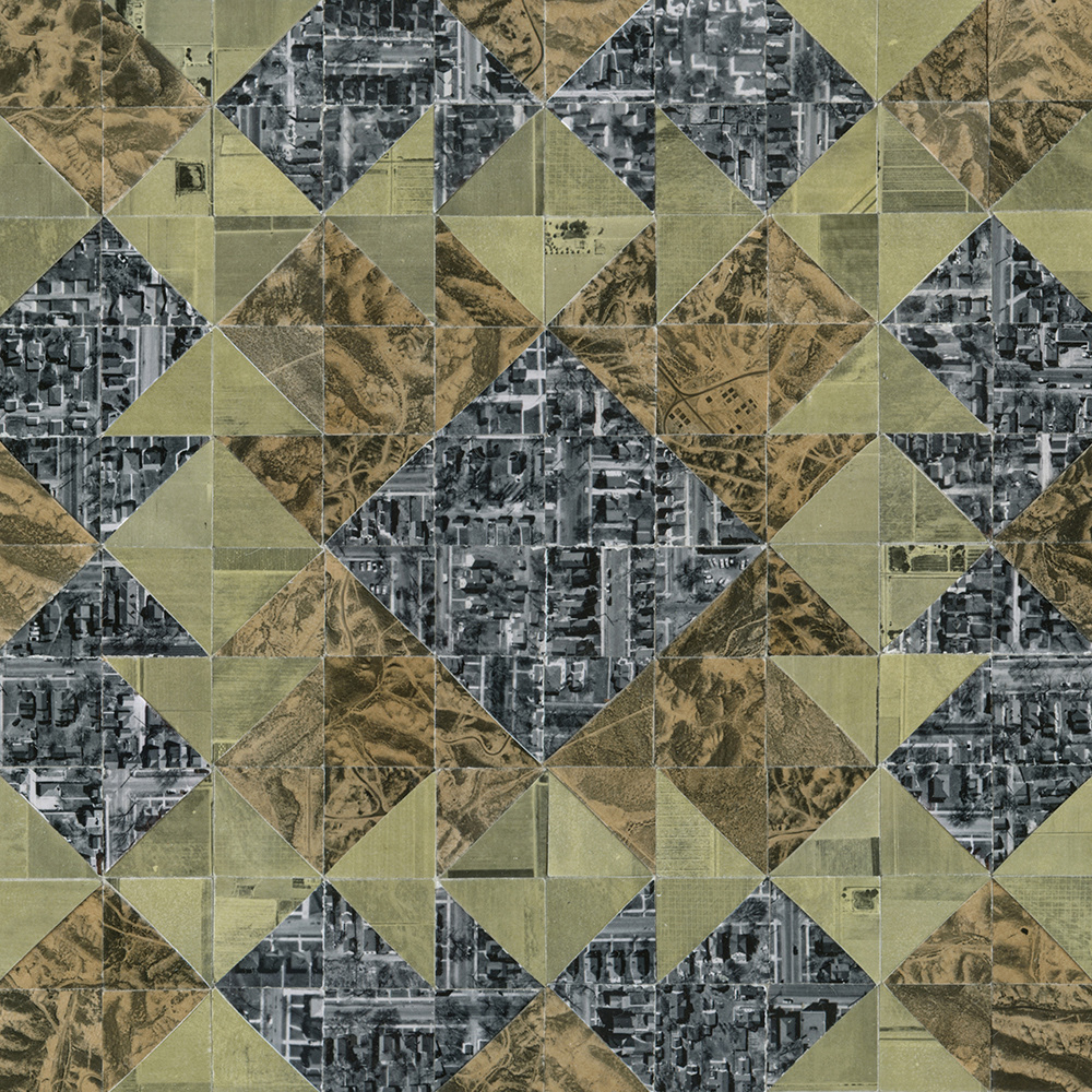 Covering combines 1/2” square and triangle sections cut from found aerial photographs of the Earth's surface to produce quilt patterns. These pieces use photos of neighborhoods, cities, farmland, bodies of water, rugged terrain, and other landscapes to create the various textures. Much like the Earth, a quilt documents the lives of numerous generations and requires care to endure as it is handed down over time. The titles of these pieces (Mosaic Star, T Squares, Stars and Windows Variation, and Prairie Queen Variation) reference the traditional quilt patterns followed to create them.